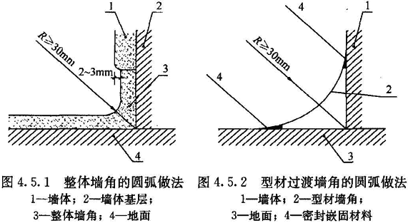 4.5.1 地面與墻面的夾角應(yīng)為曲率半徑只不小于30mm的圓角。當(dāng)用柔性材料粘貼地面時,在墻面上應(yīng)延伸至地面以上形成圓角并與墻面平齊,或略縮進(jìn)2mm~3mm,突出的墻面應(yīng)圓滑過渡(圖4.5.1)。需經(jīng)常沖刷的地面,地面材料在墻面上延伸高度應(yīng)大于150mm。