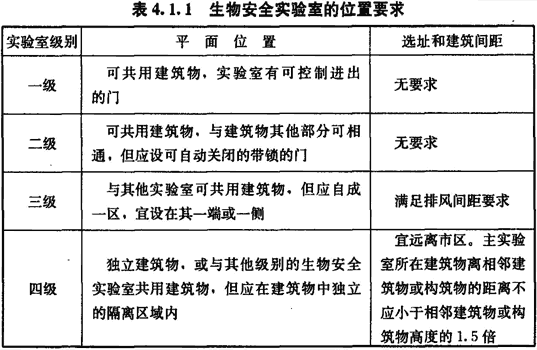 4.1.1 生物安全實(shí)驗(yàn)室的位置要求應(yīng)符合表4.1.1的規(guī)定。